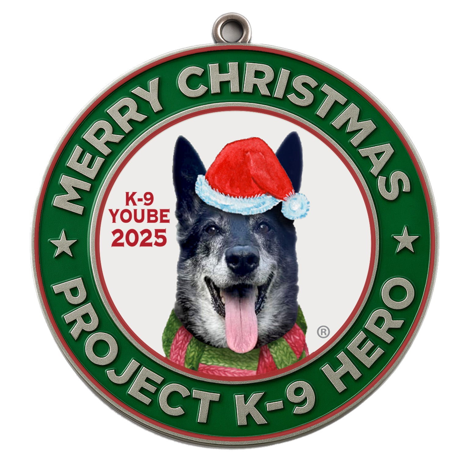 Our 2nd in the Series Annual Holiday Ornament is Here! Celebrate the season with this year’s collectible ornament featuring K-9 Yoube in a festive holiday hat. This 3-inch, double-sided metal ornament reads “Merry Christmas” on one side and “Happy Holidays” on the other.