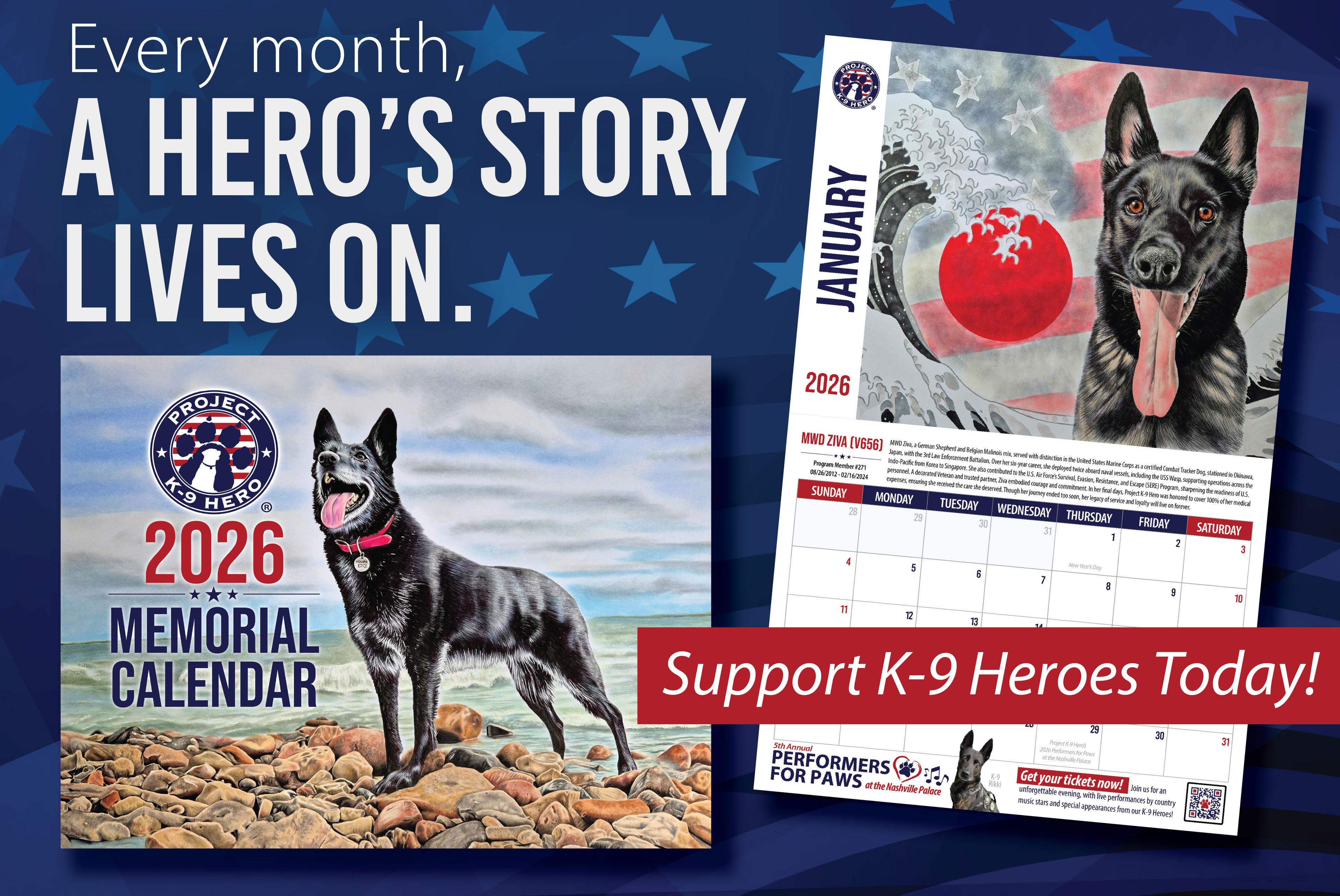 Celebrate the life and legacy of America’s retired Police K-9s and Military Working Dogs with our 2026 Project K-9 Hero Memorial Calendar. Each month features a hand-drawn portrait and heartfelt story honoring one of our nation’s four-legged Heroes, from their brave service to their well-earned retirement and beyond.